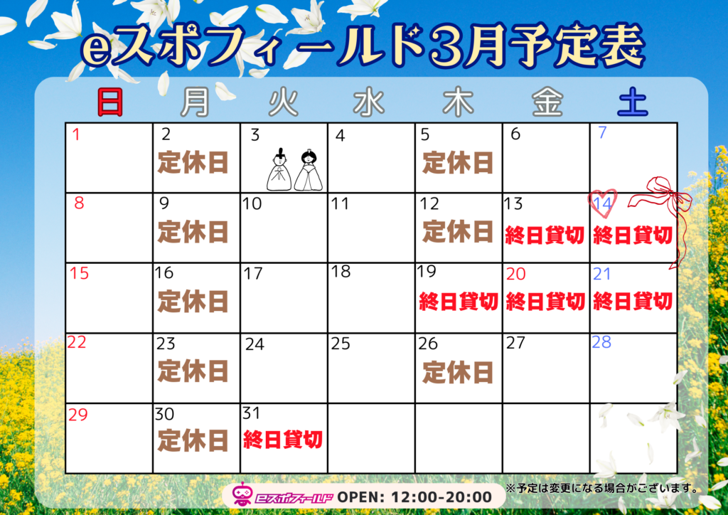 【3月営業日のお知らせ】 / お知らせ / By espofield 平素よりeスポフィールドをご利用いただきありがとうございます。2026年3月の予定表になります。【営業時間】全日 12:00~20:00【定休日】毎週 月曜日・木曜日店舗都合により、店休日や営業時間が通常と異なる日がございます。詳細は下記のカレンダーをご確認ください。また、予定は変更になる場合がございますのでご注意ください。3月も皆様のご来店お待ちしております。